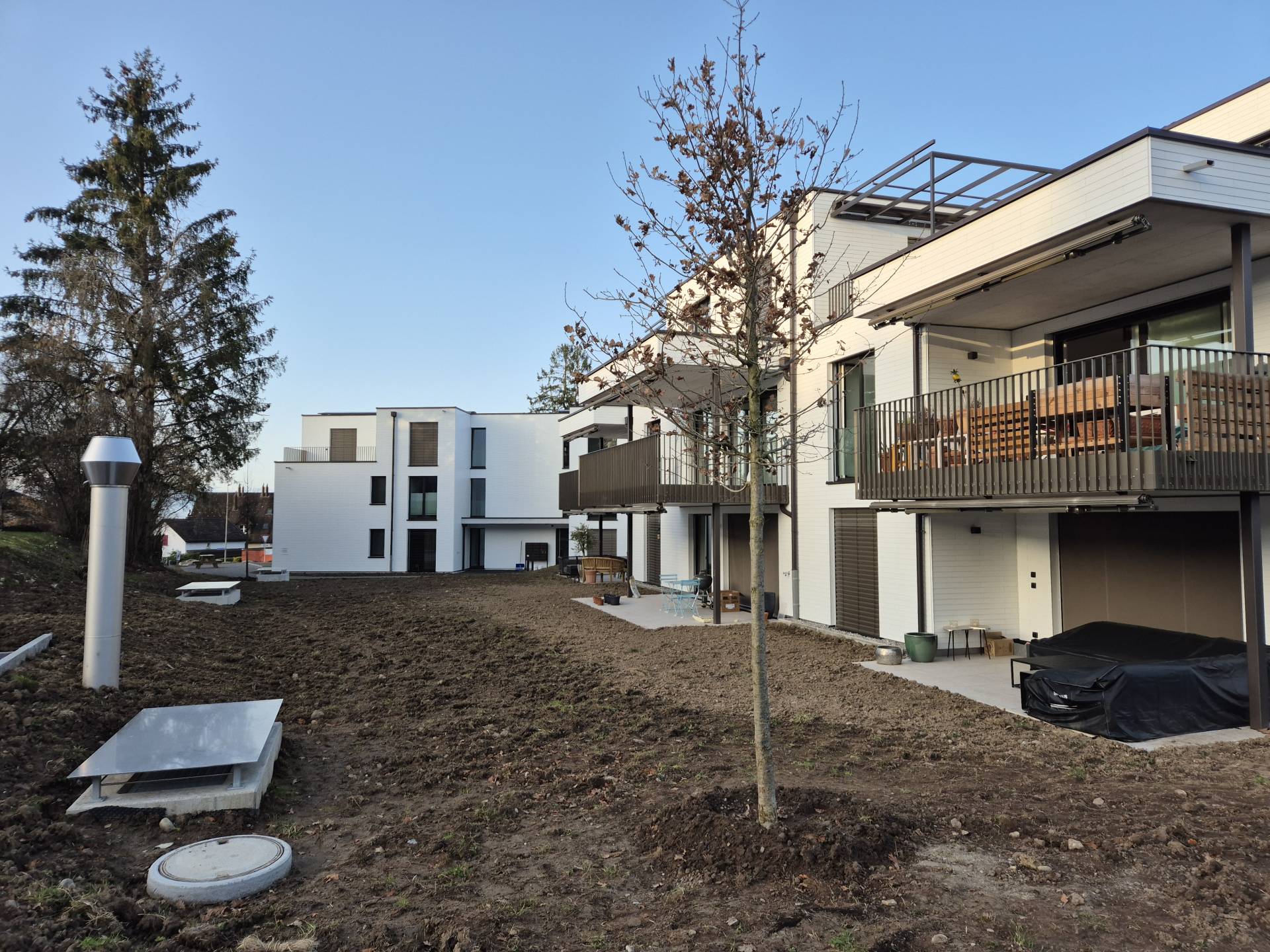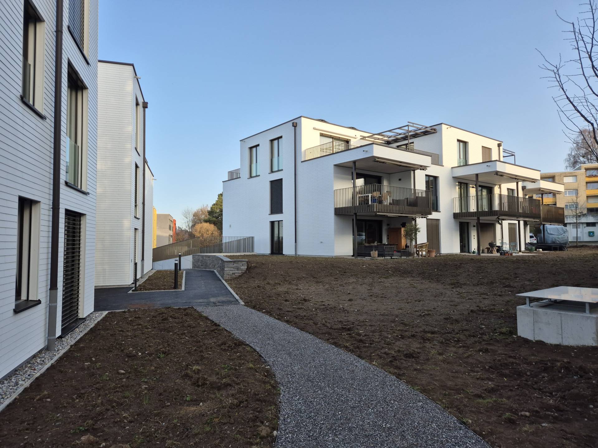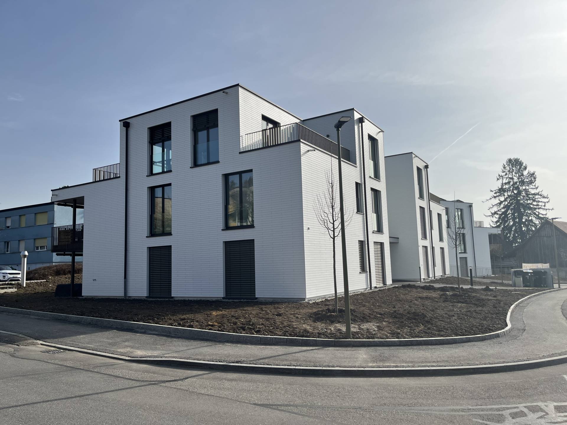 Die Mehrfamilienhäuser fallen durch ihren modernen Baukörper und die hochwertigen Faserzementplatten-Fassade, die dem Gebäude ein zeitgemässes und ansprechendes Erscheinungsbild verleihen, positiv auf. Dank einer Photovoltaikanlage auf dem Dach wird ein Grossteil des benötigten Stroms umweltfreundlich erzeugt. Die Erdsondenwärmepumpe sorgt für eine effiziente Beheizung im Winter und die passive Nutzung der Wärmepumpe ermöglicht eine angenehme Kühlung im Sommer, ohne zusätzliche Energie zu verbrauchen. Diese innovative Technologie macht die Wohnanlage nicht nur nachhaltig, sondern auch äusserst komfortabel.