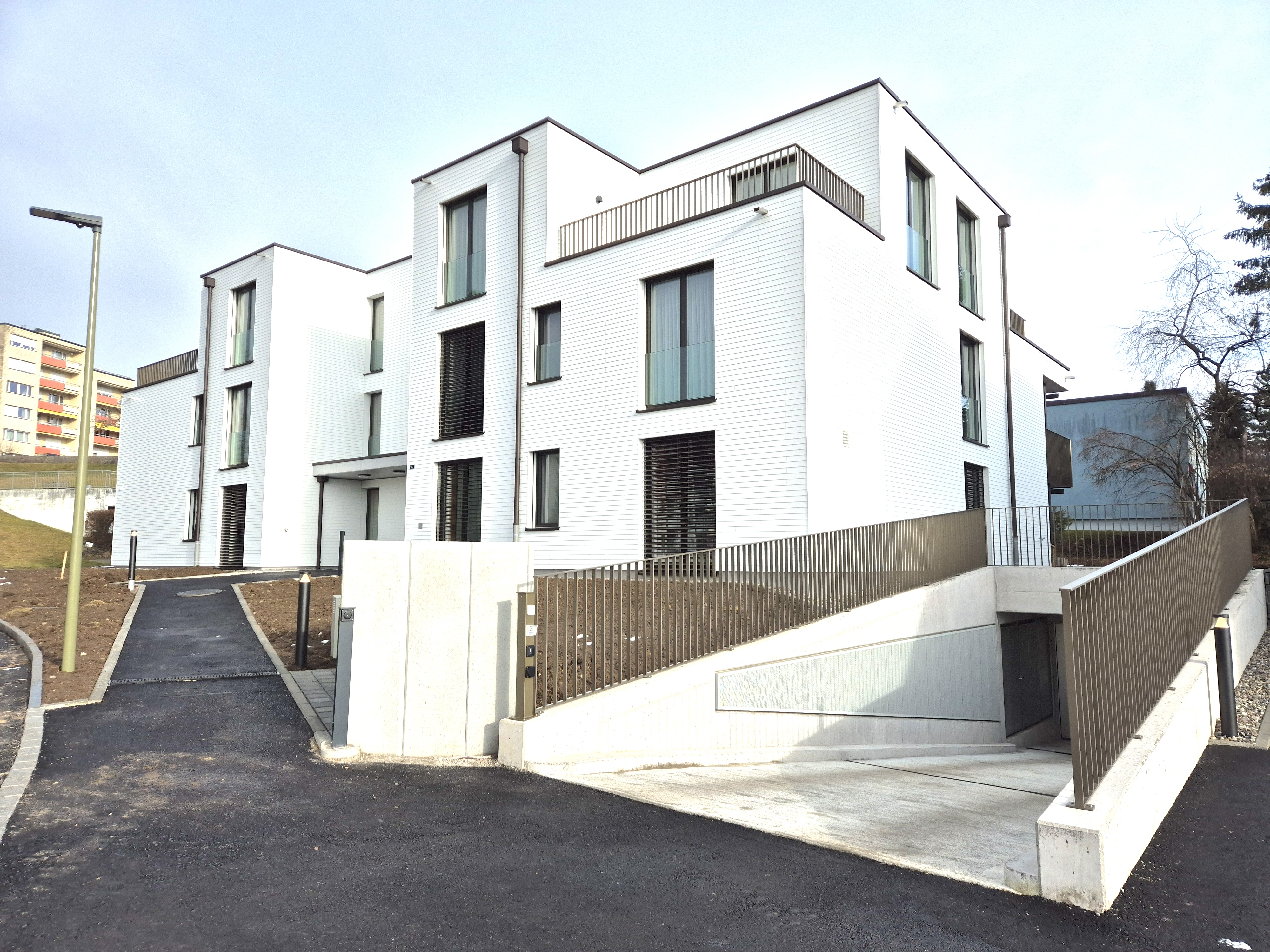Die Mehrfamilienhäuser fallen durch ihren modernen Baukörper und die hochwertigen Faserzementplatten-Fassade, die dem Gebäude ein zeitgemässes und ansprechendes Erscheinungsbild verleihen, positiv auf. Dank einer Photovoltaikanlage auf dem Dach wird ein Grossteil des benötigten Stroms umweltfreundlich erzeugt. Die Erdsondenwärmepumpe sorgt für eine effiziente Beheizung im Winter und die passive Nutzung der Wärmepumpe ermöglicht eine angenehme Kühlung im Sommer, ohne zusätzliche Energie zu verbrauchen. Diese innovative Technologie macht die Wohnanlage nicht nur nachhaltig, sondern auch äusserst komfortabel.