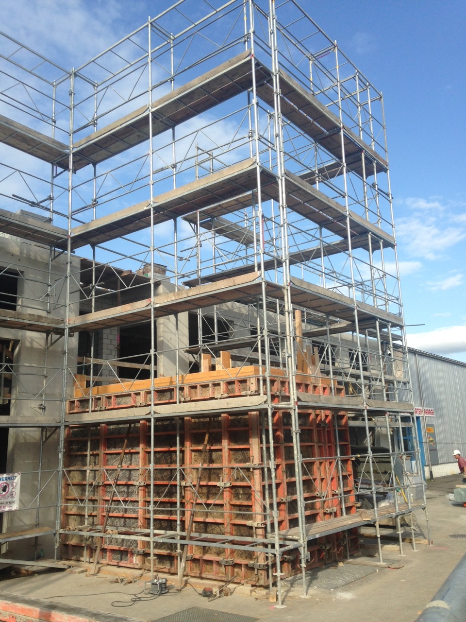 - Zeile2 Beschreibung: Hier sehen sie ein 44.50 m hohe Spezial-Pfählungsmaschine im vollen Einsatz. Das gesamte Gebäude musste auf Pfählen fundiert werden, da der Bodensee sehr nahe liegt. 18 Ortbetonpfähle und 89 Ortbeton-Verdrängungs-Pfähle mussten gebohrt werden damit das Gebäude danach auf einem echten Fundament zu stehen kommt.
