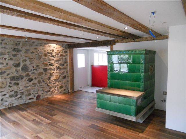 - Zeile2 Beschreibung: Das Herzstück des Bauernhauses bildete der Kachelofen. Dieser wurde erhalten und erstrahlt nun im neuen Glanz.